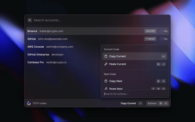 • Local Database mode: The encryption key is stored locally in Raycast's secure storage. Your TOTP secrets are decrypted only when the extension is active.