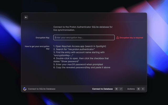 • Local Database (Live) - Reads directly from Proton Authenticator's local database. Accounts sync automatically on every launch.