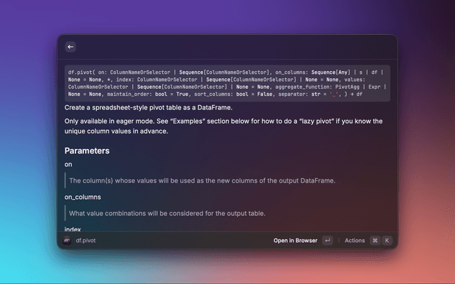 A Raycast extension that lets you search the Polars API reference and preview detailed documentation without leaving Raycast. Results include signatures, descriptions, parameters, and return values, with quick actions to open the official docs in your browser.