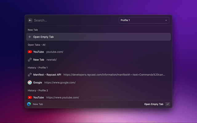Open profile support is limited to opening tab in new profile window. You can customize default tab opening behaviour in Preferences.