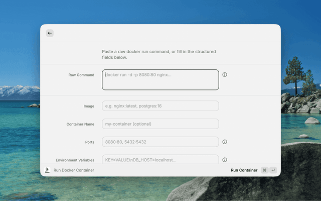 A flexible form that supports two workflows: paste a raw docker run command, or fill in structured fields individually.