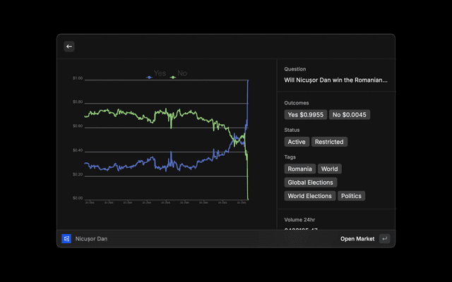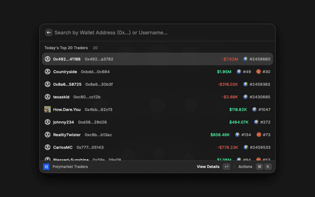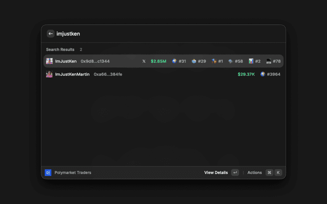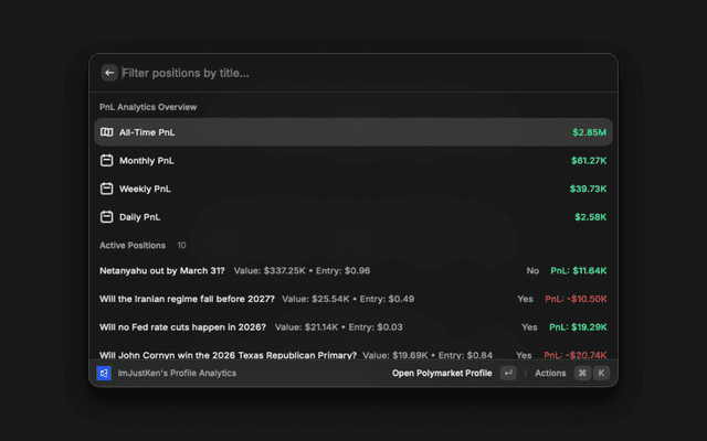 A Raycast extension for searching, viewing, and analyzing markets and trader profiles on Polymarket.com. View market prices, statistics, trader analytics, and trading data directly from Raycast.