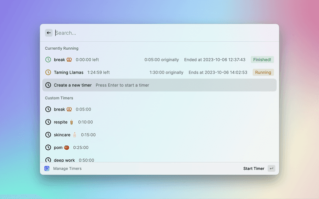 raycast/extensions repo, please ping me (@ThatNerdSquared) so that I don't miss your request!@ThatNerd(Squared)) if I have not responded to you in a timely manner.src/hooks/useTimers.ts contains the custom React hook that I use for state management across various commands, and timerUtils.ts contains backend functions I use to create the actual timer files.customTimers.json file as an array of CustomTimers, and running timers are stored as text files where the filename is [date and time started, with illegal characters replaced with __]---[length of timer in seconds] and the file content is a single line with the name of the timer.Sound effects procured royalty-free from Mixkit.