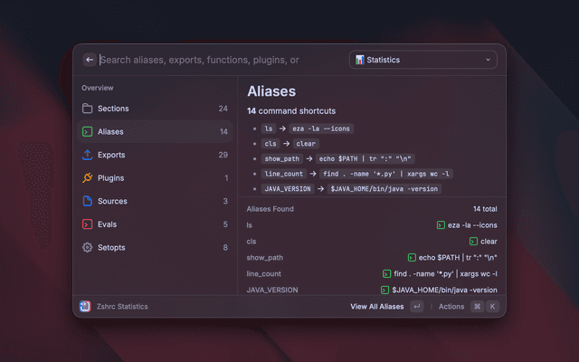 | 📊 | Statistics & Overview | Comprehensive statistics of your zshrc configuration with counts of aliases, exports, functions, plugins, and more |