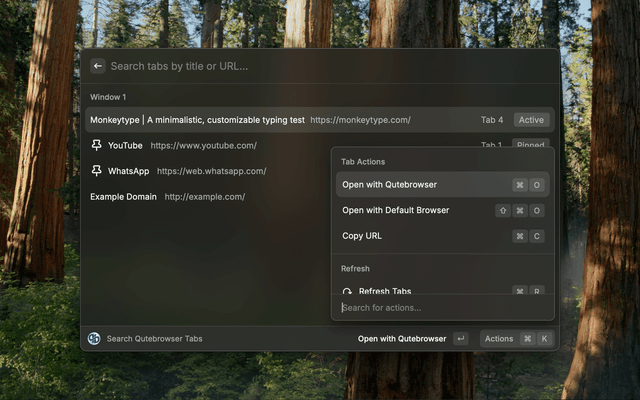 • Open the extension: Launch Raycast and search for "Qutebrowser Tabs"