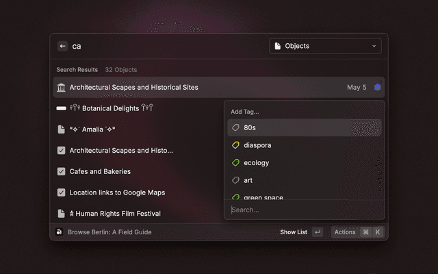 - Interact: Press Enter to view the object in Raycast or Command+Enter to open it in Anytype.