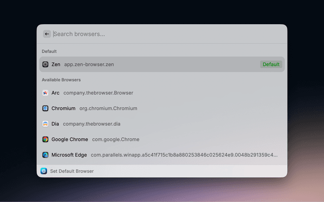 Conveniently set your default browser via Raycast commands.