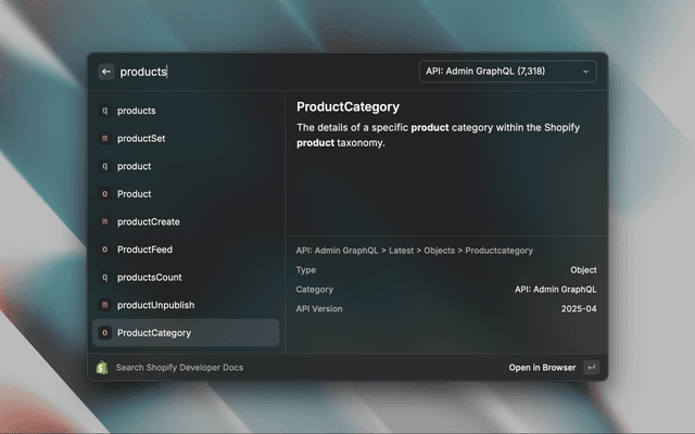 This Raycast extension searches through the Shopify developer documentation at https://shopify.dev/docs/ and lets you open up the result in your browser. Useful for quickly looking up GraphQL mutations and object types.