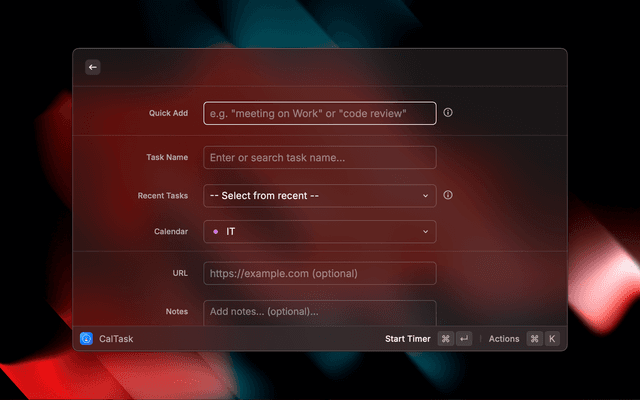 - Enter task name or select from recent task suggestions (auto-fills calendar, notes, and URL)