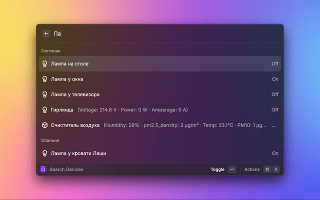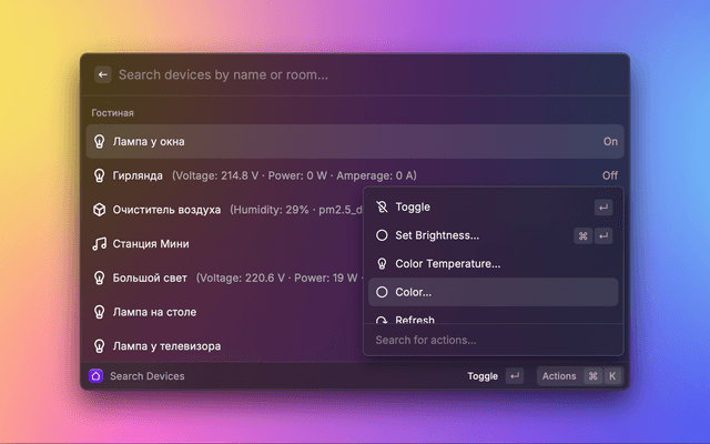 Control Yandex Smart Home devices and run scenarios from Raycast.
