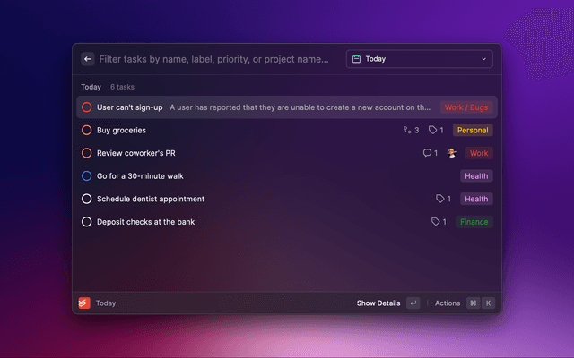 Check your Todoist tasks from within Raycast and quickly create new ones.