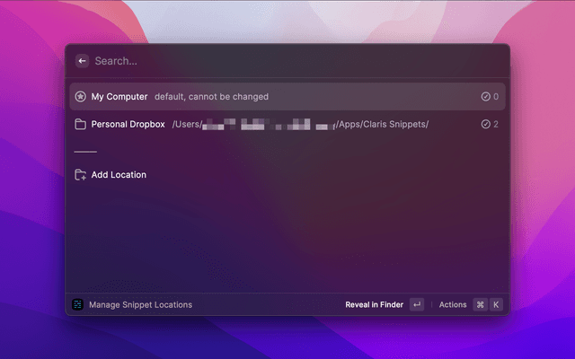 You can share your snippets with the world by posting them to a git repository. This is a great way to share snippets with your team, or even the entire Claris community! To use snippets from a git repository, add a new location from the "Manage Snippet Locations" command add choose "Git Repository" as the location type. Then enter the URL to the git repository.