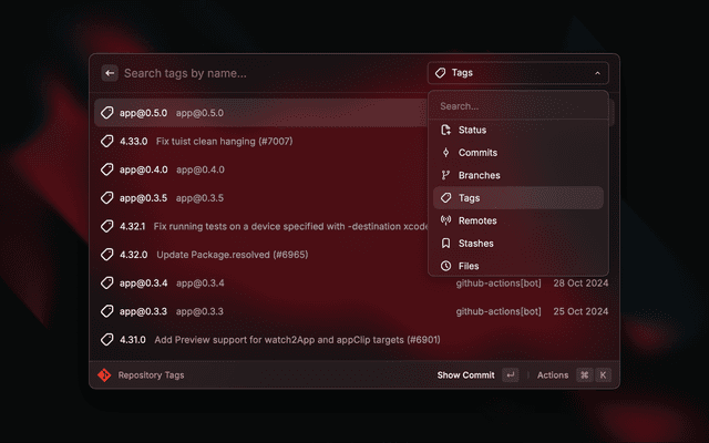 ⌘ + 1 to go to Status⌘ + 2 to go to Commits⌘ + 3 to go to Branches⌘ + 4 to go to Tags⌘ + 5 to go to Remotes⌘ + 6 to go to Stashes⌘ + 0 to go to FilesYou can create a Quicklink to open a specific repository without needing to select it in the Manage Git Repositories list.
