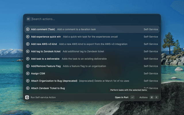 Access your Port internal developer portal directly from Raycast. Browse dashboards, run self-service actions, search your software catalog, and ask Port AI questions.