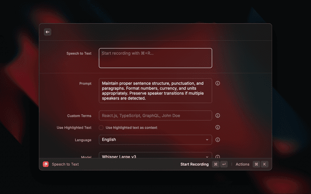 - Open Raycast and search for "Speech to Text"