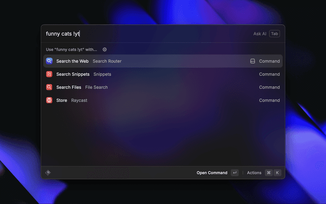 !g cats searches Google for "cats"!w cats searches Wikipedia for "cats"Help me fix my code !t3 uses t3.chat to ask AI to fix your codemarkdown parser @gh searches for "markdown parser" specifically within Github's domain (site:github.com)Pro Tip: โจ For the best experience, set up Search Router as a Fallback Command in Raycast. This allows you to use bangs directly from the main Raycast search without having to first open the extension!