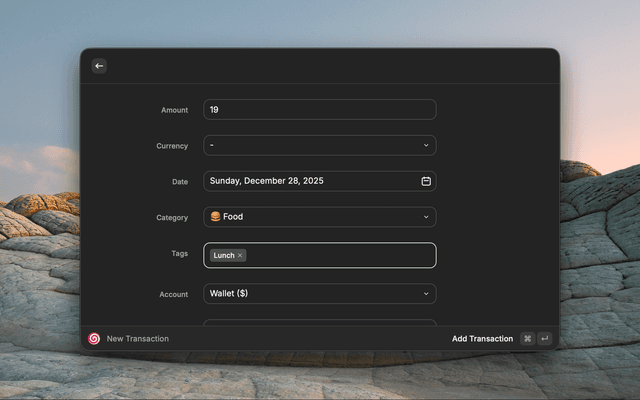 | Add Expense | Quick form to add expenses with category, tags, account, and recurring options |