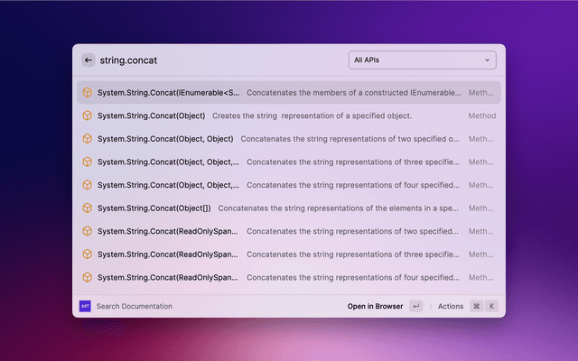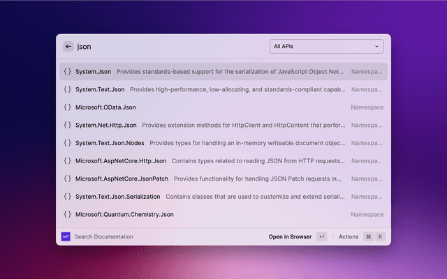 Quickly search .NET API documentation and open it in the browser.