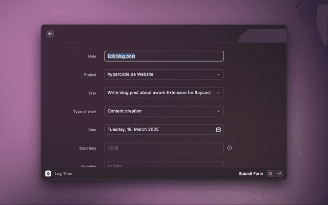 Log time for a task or project right in Raycast. Press ⌘⏎ to submit.