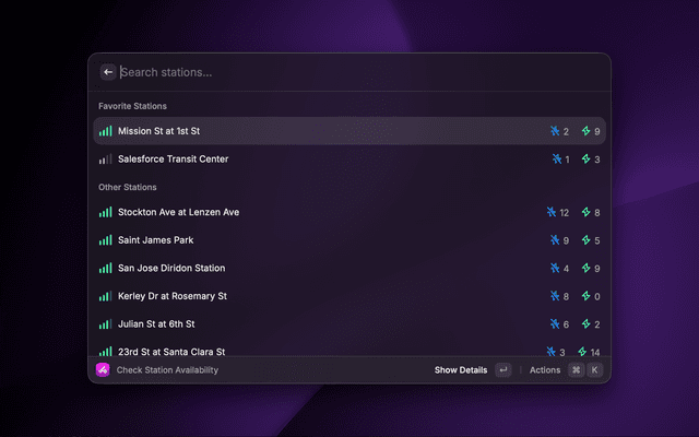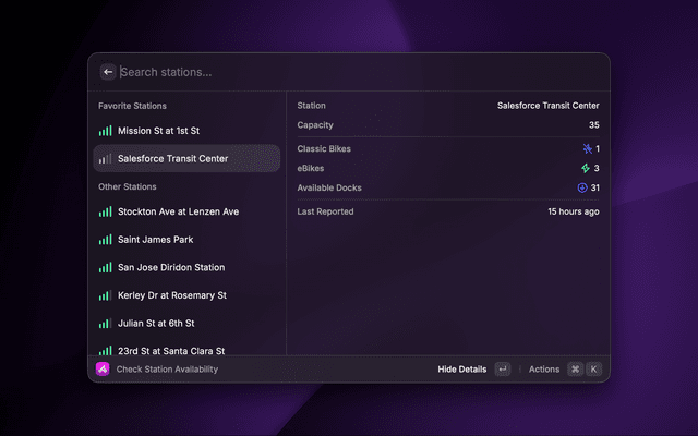 Check bike availability at bikeshare stations run by Lyft. You will be prompted to select a region on first run.