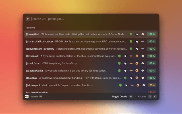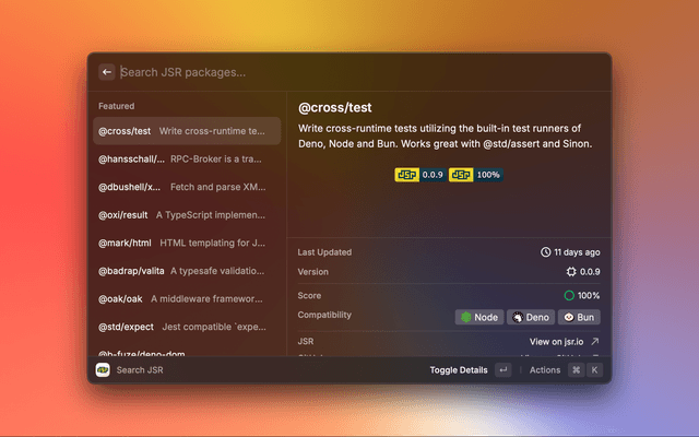 Search through JSR, the open-source package registry for JavaScript/TypeScript.