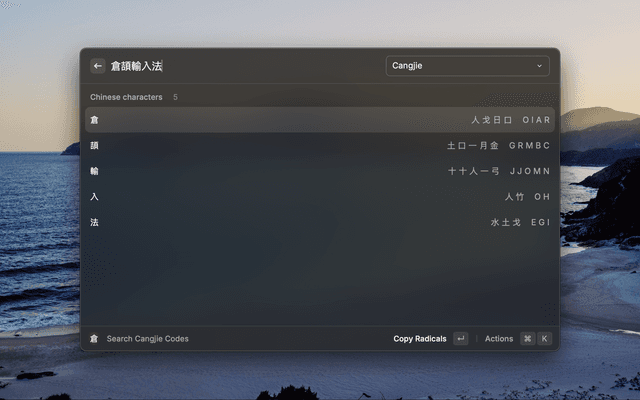 Fast Chinese characters lookup for Cangjie and Sucheng codes. Supports instant search from selected text and provides both English letters and Chinese radicals.