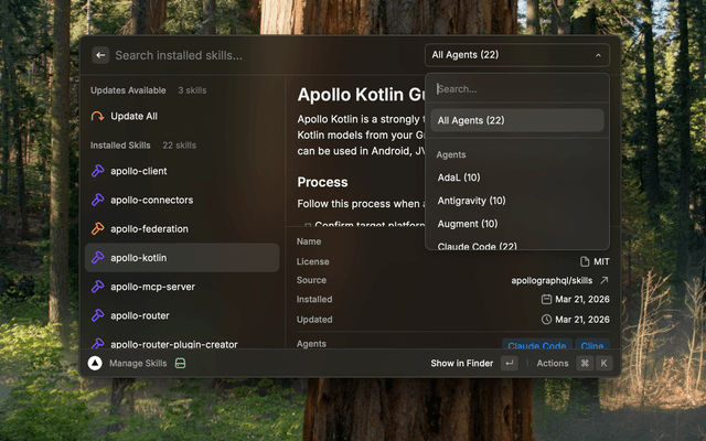 View, update, and remove installed skills. Outdated skills are highlighted with an orange icon and grouped in the "Updates Available" section. Filter by agent to see which skills are available for each AI agent.