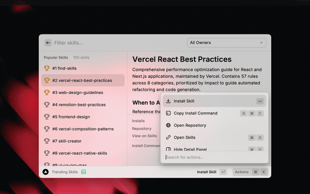 • View skill details inline with SKILL.md content, including description, license, compatibility, and allowed tools (toggle with Cmd+D)