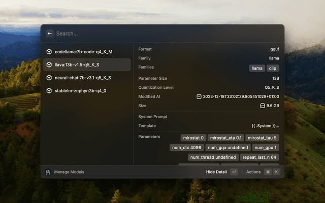 Ollama installed and running on your mac. At least one model need to be installed throw Ollama cli tools or with 'Manage Models' Command. You can find all available model here.