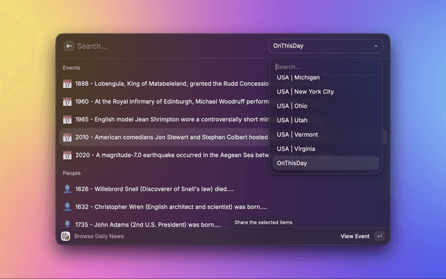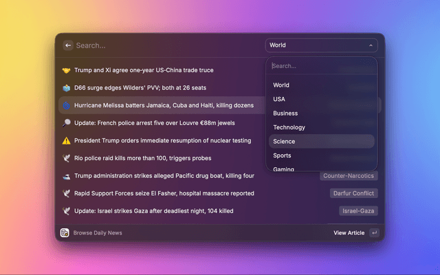 • Open Raycast, type "Kagi News," select a category, and browse articles.