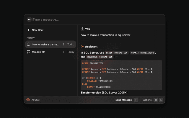 • Actions: Copy, Paste, Continue in Chat