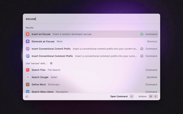 Selects a random excuse from a list of over 250 developer-themed excuses for not getting the work done and pastes it right into your window.