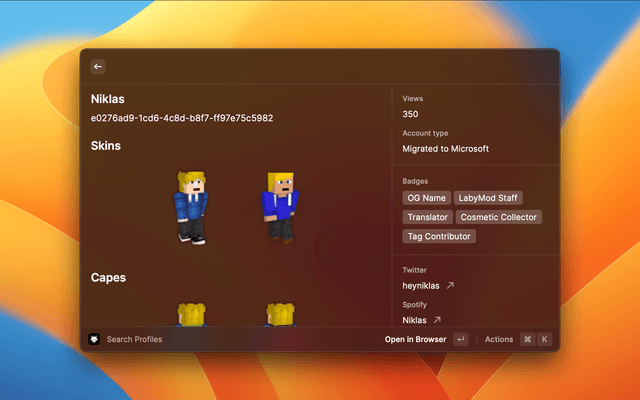 Search and view Minecraft user profiles and textures like skins and capes with data from laby.net.
