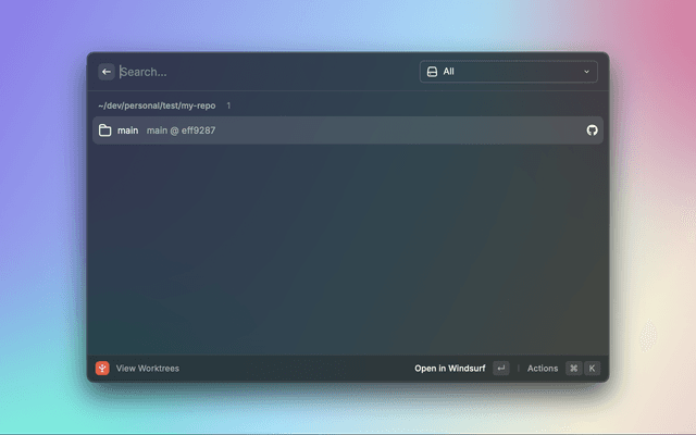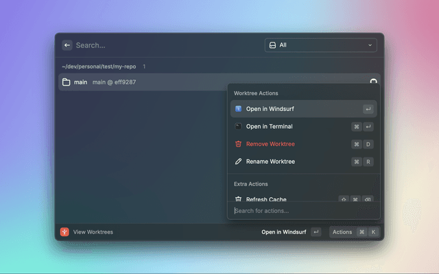 A powerful Raycast extension for efficiently managing Git worktrees with a streamlined interface. This extension helps developers work with multiple branches simultaneously by creating and managing Git worktrees through an intuitive Raycast interface.