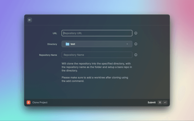• Clone Projects: Easily clone repositories as bare repos, ready for worktree management