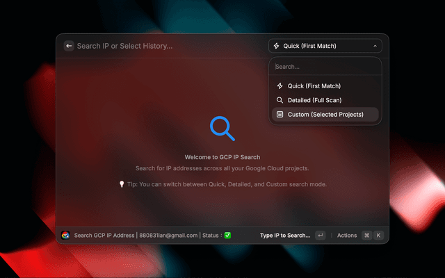 Enter - Open in GCP Console (in result view) / Configure Custom Projects (in Custom Mode Welcome view)β + Enter - Copy GCP Console URLβ + D - Toggle Details Viewβ + M - Cycle Search Modes (Quick -> Detailed -> Custom)β + Shift + P - Configure Custom Projects (Only in Custom Mode)β + X - Remove from HistoryThe extension searches for IPs in: