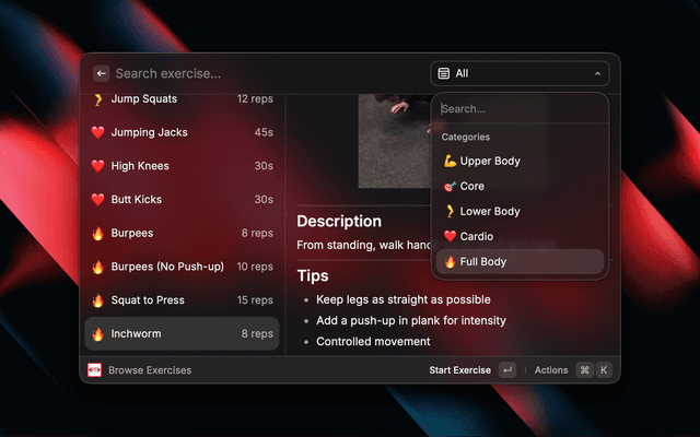 Start a random micro-workout. Perfect for quick breaks during your workday.
