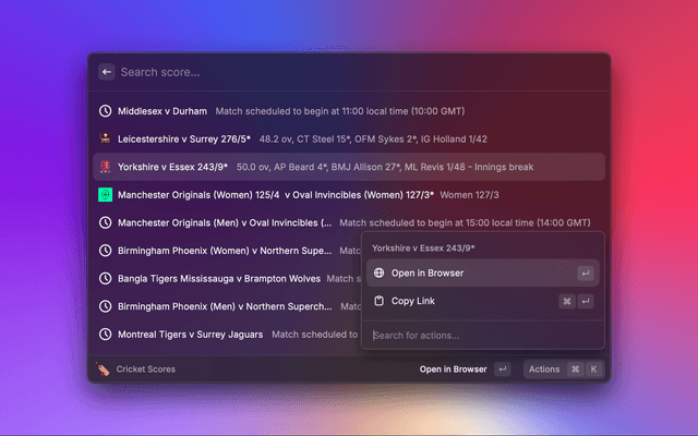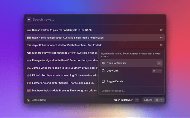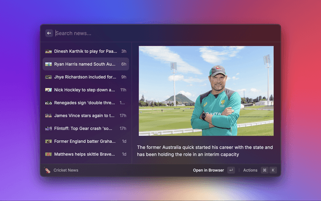 Cricket extension for Raycast. Allows you to check the latest scores and news. Data sourced from ESPNCricinfo.