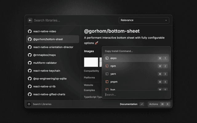 - Copy installation commands (expo, npm, yarn, pnpm, bun)