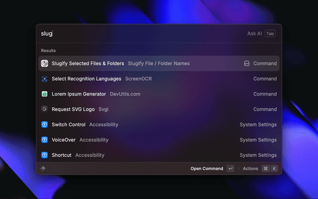 3. Run Command: Open Raycast and type "Slugify Selected Files & Folders" or use the configured shortcut