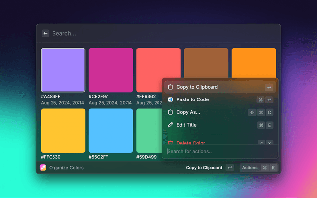 pick-color: This launches the main color picker interface.color-wheel: Opens the interactive color wheel for precise hue selection.organize-colors: Allows you to manage and categorize your color palettes.Pro tip: These commands can be customized or aliased in your Raycast preferences for even quicker access.