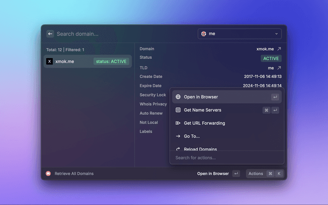 This is a Raycast extension for Porkbun. With this extension, you can fetch latest domain pricing and create, list, edit or delete DNS records, URL Forwarding and Name Servers for API-enabled domains in your account.