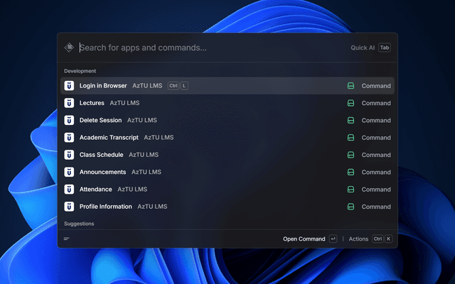 Access your Azerbaijan Technical University (AzTU) Learning Management System (LMS) data directly from Raycast. Check schedules, read announcements, and review academic records without opening a browser.
