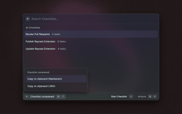 Checklist is a simple - Raycast native - app that allows you to create and work on checklists. Based on The Checklist Manifesto you know checklists can save lives and make you more productive by improving the quality of repetitive tasks. Checklist lets you create, edit and delete checklists. You can easily start working on them and keep track of the progress.